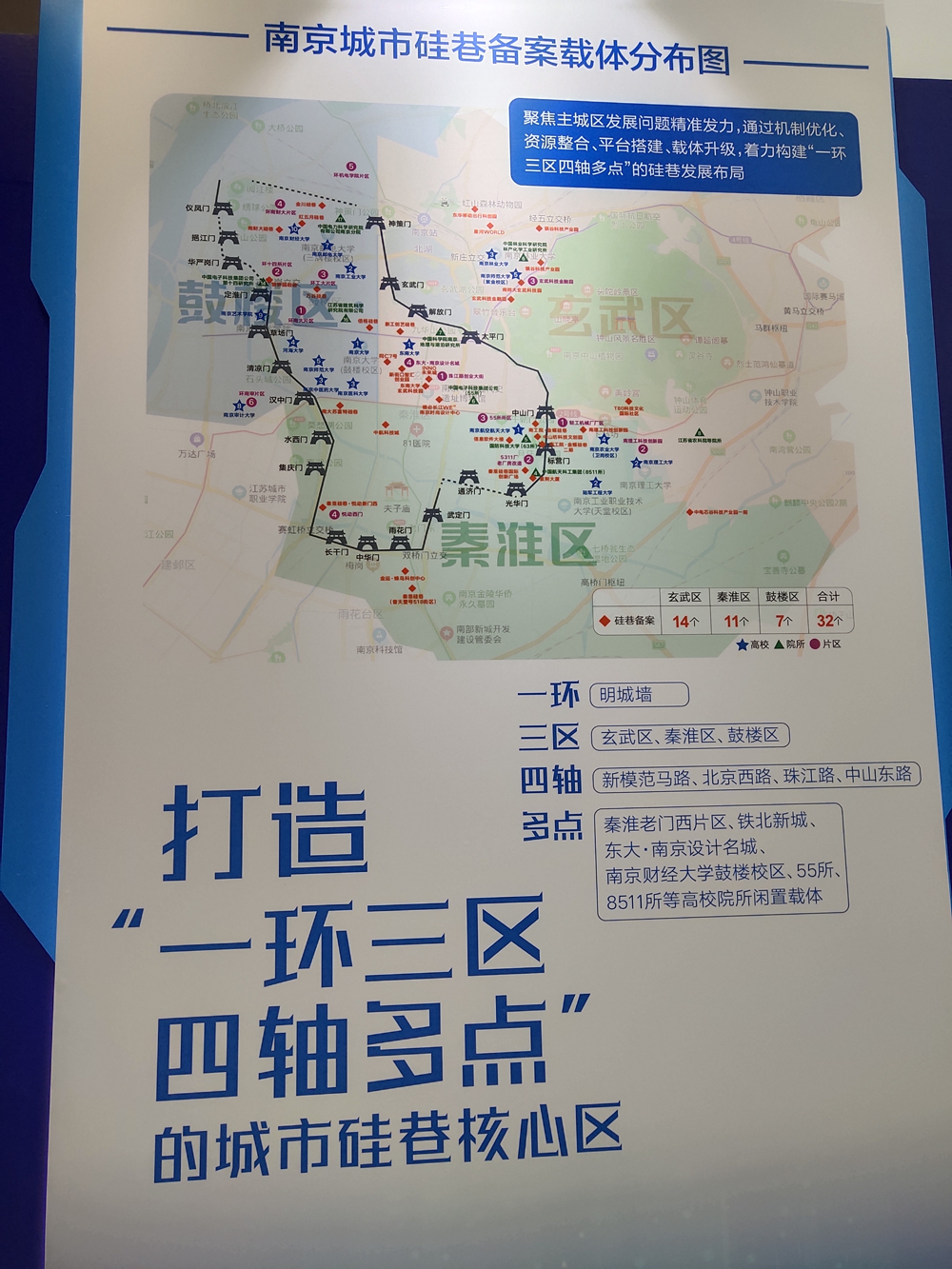 打造城市硅巷是南京结合城市更新、用好创新资源、激活主城区存量空间和低效载体的创新举措,也是南京建设创新名城的重要抓手和特色品牌。近年来,我市重点在玄武、秦淮、鼓楼三个主城区打造城市硅巷,形成“一环三区四轴多点”的布局,一批集约紧凑、功能互补、产城一体、活跃度高的城市创新创业载体加速涌现。目前,全市备案硅巷载体面积已超100万平方米,集聚高新技术企业154家,培育引进科技型企业近1200家,产业集聚度超过70%。硅巷建设中,南京借鉴国内外先进城市经验,结合自身资源禀赋,明确“坚持主城区坐标、贯彻无边界理念、解决空心化问题、避免二房东思维”原则,初步探索出一条具有南京特色、符合南京实际的城市硅巷建设路径。